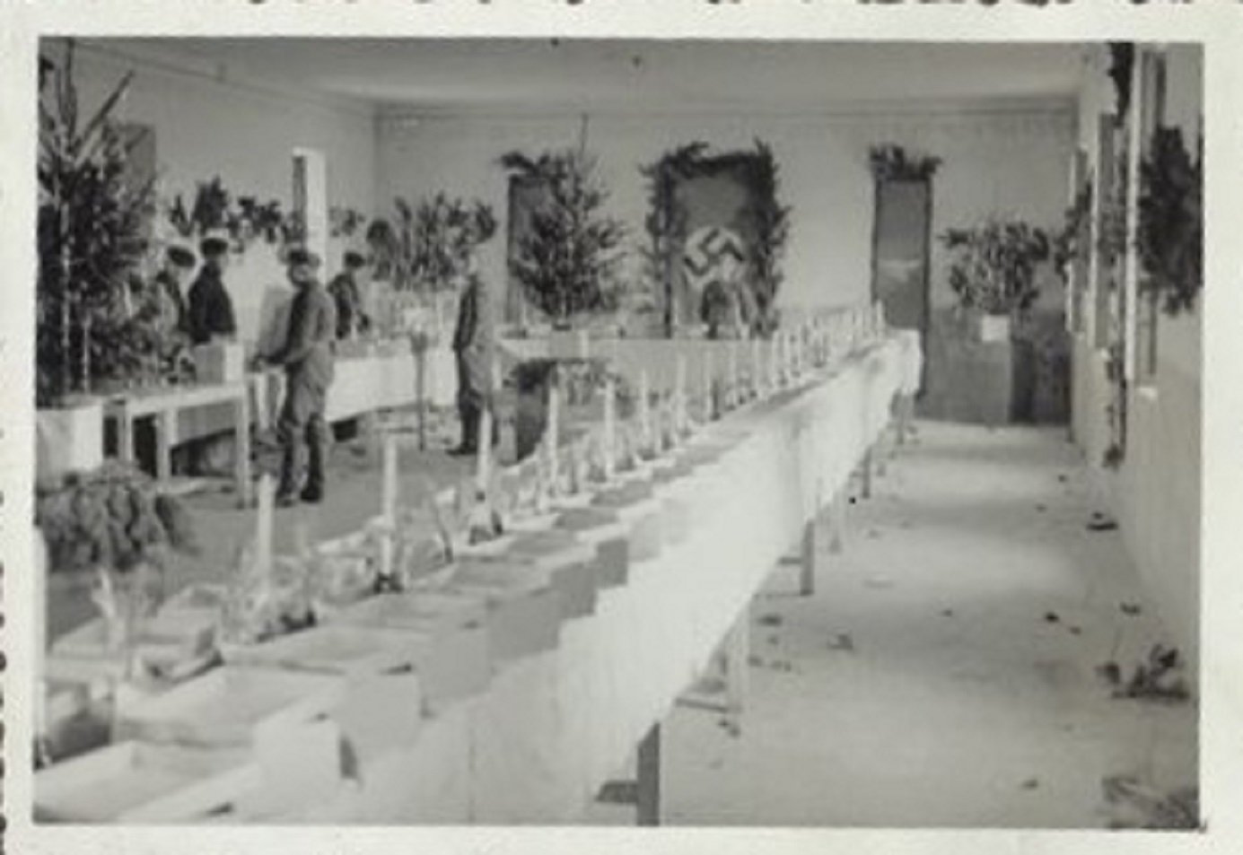 Según los testimonios familiares conservados y documentado en fuentes como el estudio “La presencia alemana en Bronchales durante la Batalla de Teruel” (Rehalda, 2024), los republicanos que llegaron al pueblo no solo encontraron material militar alemán abandonado, sino que capturaron a los soldados alemanes que no pudieron evacuar a tiempo. Por lo visto, sí habían tenido tiempo de organizar una buena comida para saborear el delicioso cordero aragonés en el antiguo Hotel Ballester (hoy en desuso). La svástica y las boinas son un homenaje al surrealismo ¿dónde si no podía haber nacido Luis Buñuel sino en Aragón?